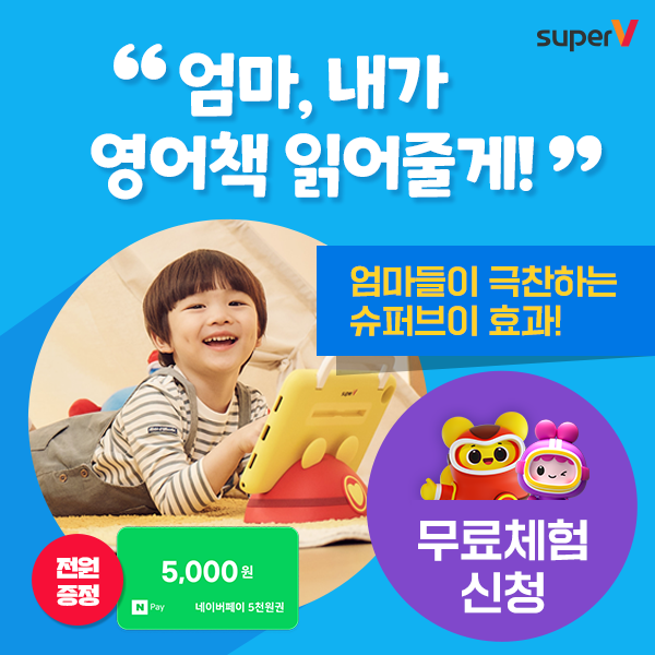 유아교육을 위한 스마트 학습 슈퍼브이 7일 무료체험 & 교재 4종 증정(영어,한글,수학 등) 초등학교 입학이 2~3년 남았다고 아직은 이르다고 생각하셨다면, 한 가지 놓치고 계신 게 있습니다. 이 시기에 배운 학습 습관이 평생을 좌우한다는 사실이죠.