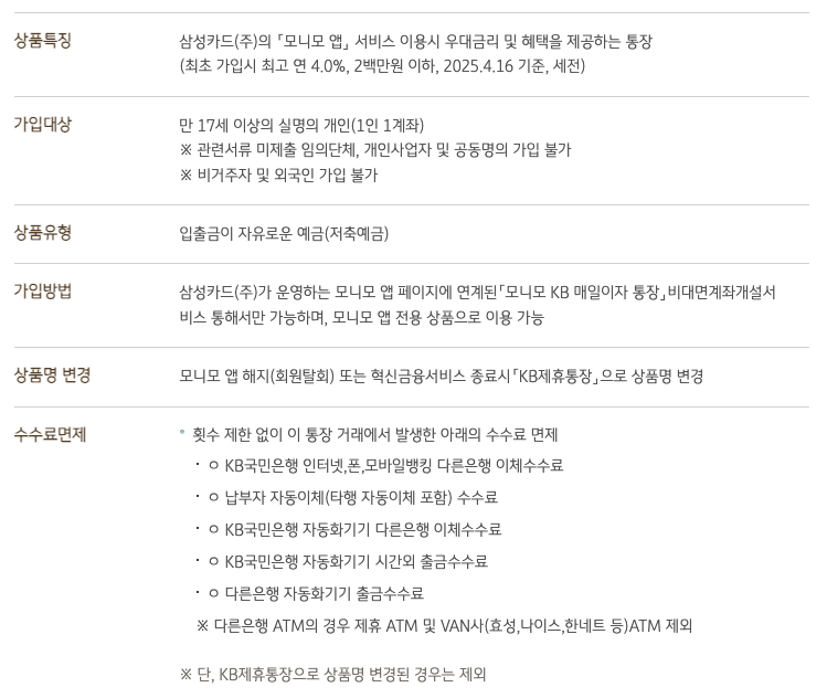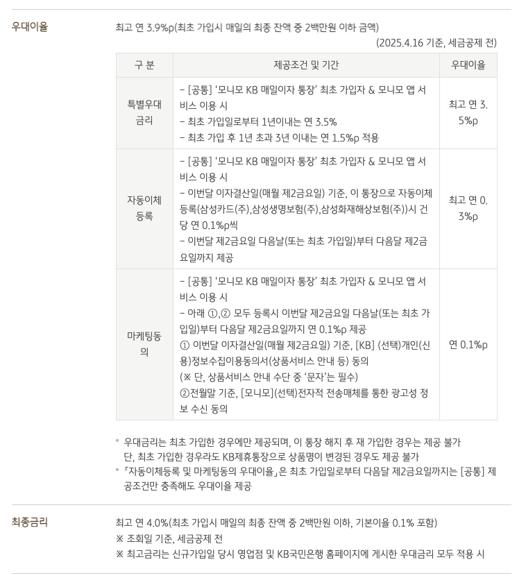 ‘모니모 KB 매일이자 통장’은 모니모 앱에서만 개설 가능한 수시입출금통장으로, 지난 2024년 9월 금융위원회로부터 혁신금융서비스로 지정된 바 있다. 일 잔액 200만원까지 최대 연 4.0%의 금리(기본이율 연 0.1%, 우대금리 최대 연 3.9%p, 2025.04.21기준, 세금공제 전)를 제공한다.